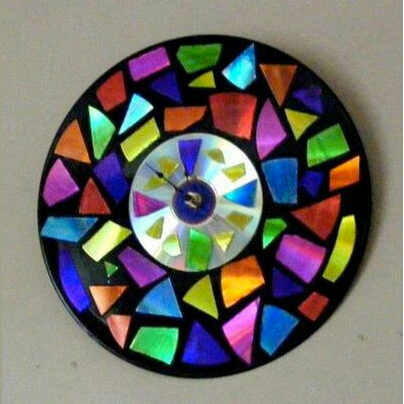 Preparar este reloj tan bonito es muy sencillo. En primer lugar pegaremos uno de los CDs en la parte central del disco de vinilo, y mientras se seca la cola, cortamos a trozos con las tijeras los otros CDs  haciendo figuras geométricas (cuadrados, triángulos, rectángulos). También los pegamos al disco. Cuándo se ha secado la cola y están bien enganchados en el disco, procedemos a pintarlos con colores variados.