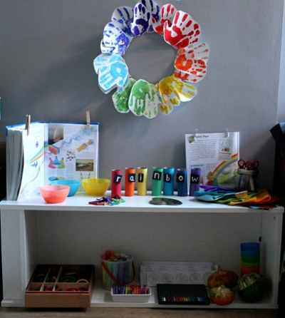 Algunas de estas actividades pueden ser diversas: Preparamos un arco iris con nuestras manos, en la que los pequeños embardurnan sus manitas con los colores del arco iris y las estampan en un papel blanco, luego las recortan (o los adultos si ellos no pueden aún) y se forma un arco o corona que decore la pared por encima del rincón. También podemos clasificar por colores, con recipientes pintados de diferentes colores, los niños han de clasificar los materiales (piezas pequeñas) según el color. Lectura y escritura de palabras y frases relacionadas con el arcoiris. Aprender los primeros trazos con la caja mágica del arco iris. Narraciones de cuentos en los que al Arco iris aparezca. Seriaciones con los colores del arco iris, etc.