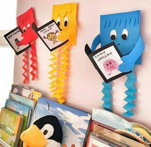 Nos encanta esta propuesta para realizar unas manualidades infantiles muy divertidas que decorarán las paredes de nuestra biblioteca para los peques. Son muy fáciles de hacer y podéis utilizar retales de cartulinas de colores que tengáis para reciclar.