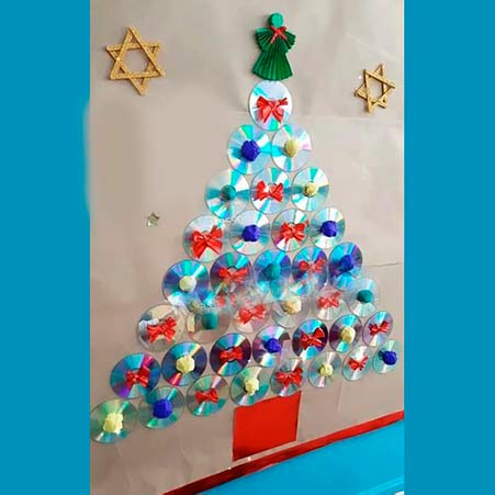 Con un lápiz, dibujaremos un triángulo grande, que nos servirá de guía para hacer el árbol. Y, a continuación, con la paletina pondremos cola en el triángulo. Entonces iremos pegando con cuidado los CDs reciclados, de manera que la cara brillante quede a la vista y la que tenga las letras pegada al papel. Lo iremos haciendo poco a poco, uniéndolos bien, procurando que quede el menor número de huecos entre ellos, pero sin solaparse entre sí. Recordad que debéis dejar espacio en la parte inferior para «la maceta» que haremos recortando un trapecio con cartulina roja (si preferís otros color también os quedará bien).