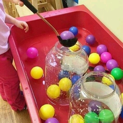 Además de fomentar el desarrollo general, potenciará un trabajo de coordinación óculo-manual y de precisión. Esto es así por que los movimientos de sus manos y brazos serán decisivos para el resultado satisfactorio de la misma, que no será otro que introducir las bolas de colores en los botes preparados para ello con ayuda de un cucharón.