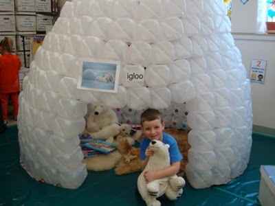 Os dejo este espectacular iglú realizado con garrafas de plástico blancas. Con una ambientación así en clase no hay niño que no quiera ir a la escuela.