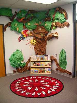 Aquí tenéis una preciosa propuesta para ambientar el rincón de la biblioteca de aula. En esta ocasión se ha decorado un rincón de la clase con un árbol realizado en papel de colores , lleno de las letras del abecedario. En su centro está instalado un mueble con los libros del aula en forma de pequeña estantería. Finalmente en el centro del rincón se ha colocado una pequeña alfombra circular para convertir este espacio en un lugar cómodo para los pequeños.